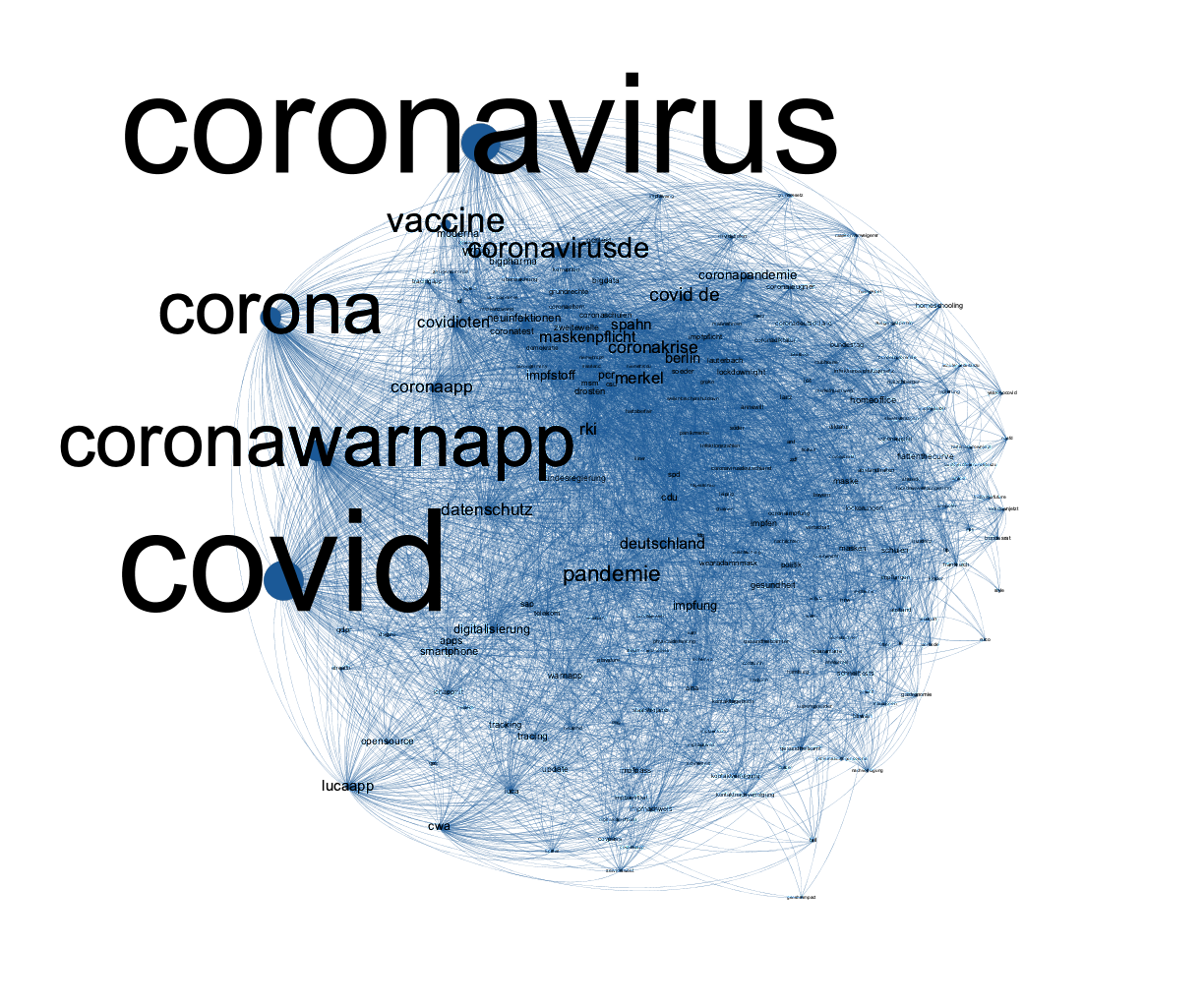 The third community detected in terms of number of hashtags (see also Table 1) is about the Corona Warn mobile contact tracing app and corona virus.