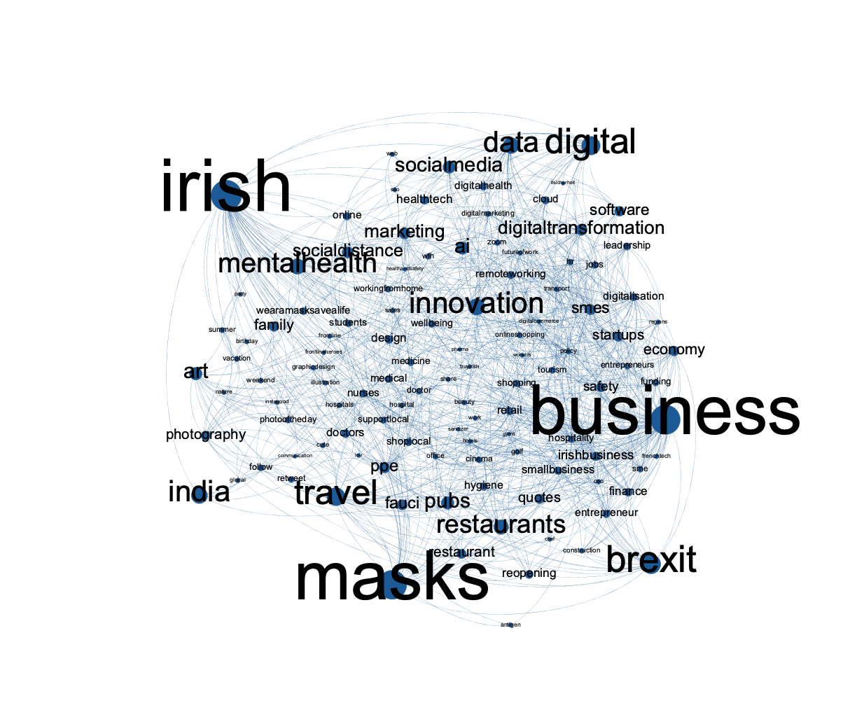 The more generic community detected is, according to Table 1, the sixth in terms of number of hashtags and covers covid-19 restrictions and covid-19 related issues in the society and the economy. The community is not associated with a specific app and the dominant hashtags are Irish, Business and Mask, as is also shown in the hashtag network of Figure 3.