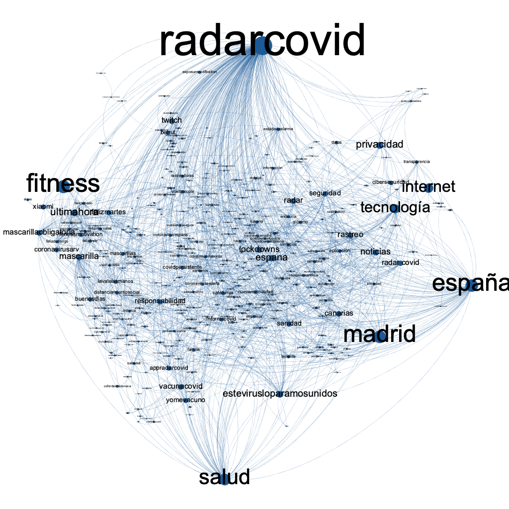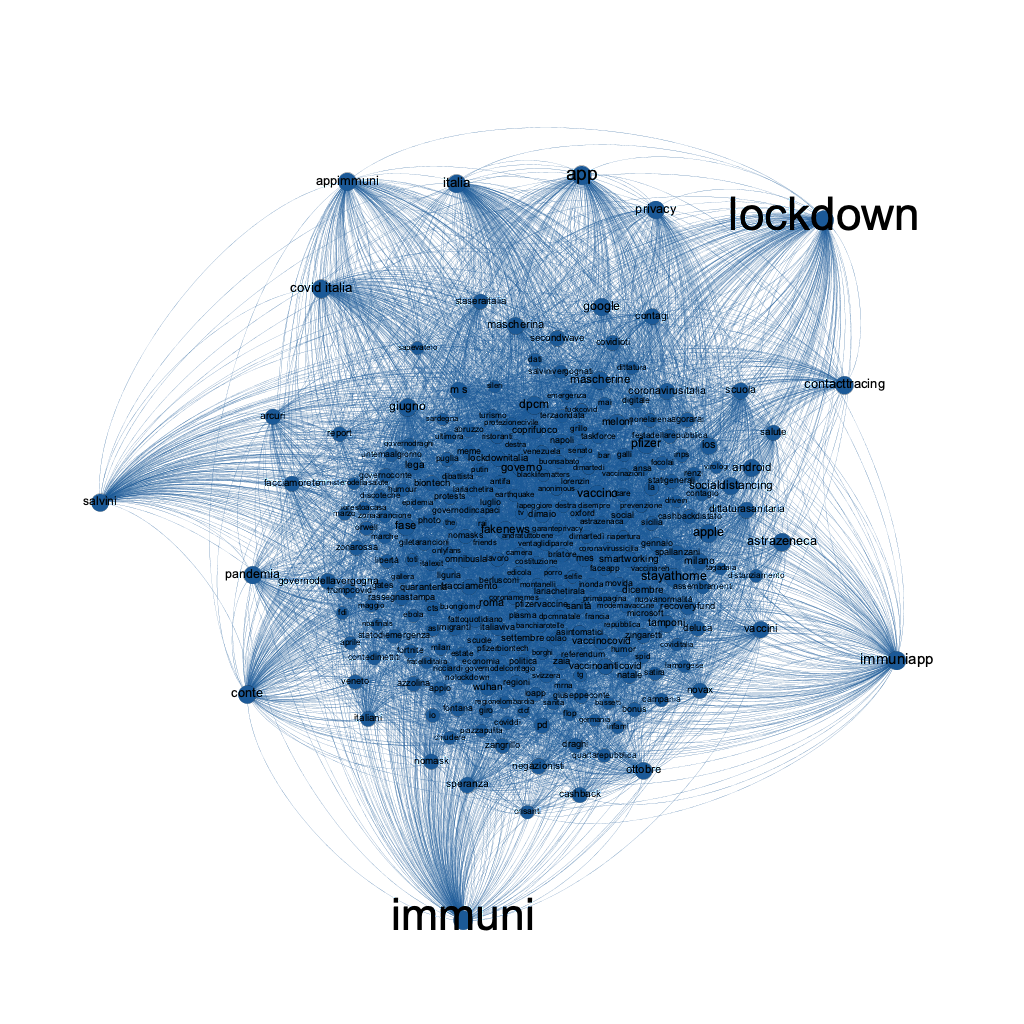 The observations mentioned above show that the community has many interconnections with the neighbouring communities. Indeed, the interconnection index has a high value and, although it does not refer to a specific mobile contact tracing app, it is well-connected with different apps, as is shown in the hashtag network of Figure 4.