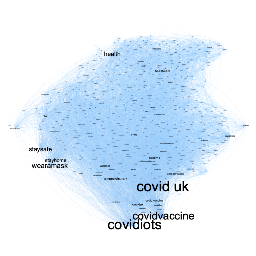 Figure 6 displays the hashtag network about the UK NHS Covid 19UK NHS Covid 19 app and Healthcare community with a total of 1195 hashtags and around ten central nodes with a high value of related hashtags (degree centrality). The topics of the central nodes refer to the spread of the corona virus in UK, healthcare, the vaccines and containment measures.