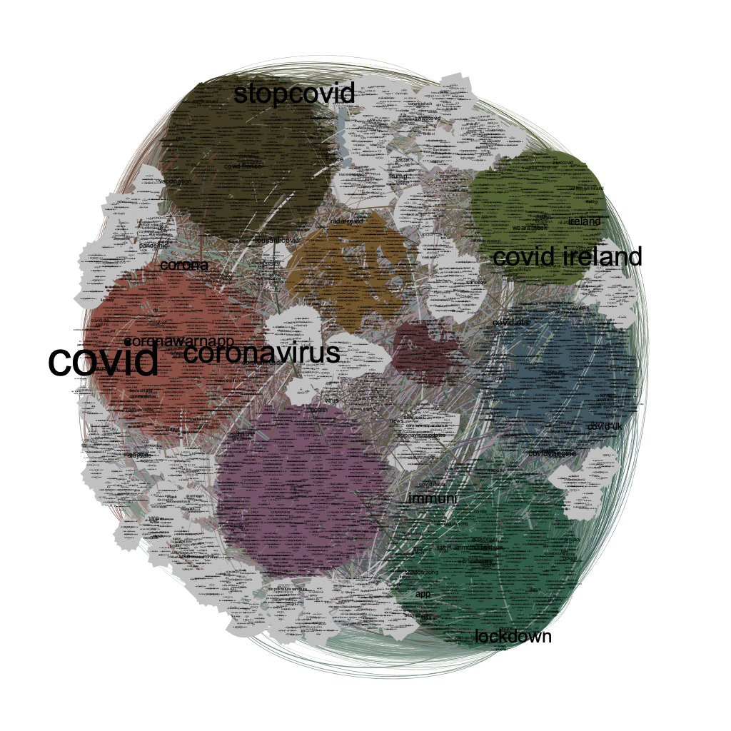 The fifth community detected in terms of number of hashtags (see Table 1) is about the Covid tracker ireland mobile contact tracing app.
