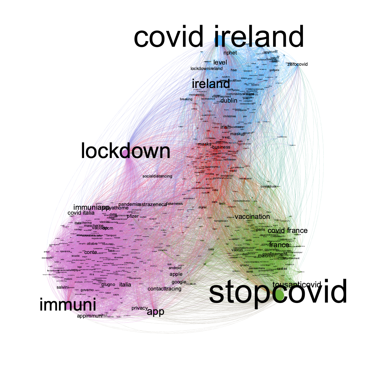 Figure 1 shows the hashtag network of around 260,000 tweets about mobile contact tracing apps. The tweets were collected from July 2020 to June 2021 using the official Twitter APIs.